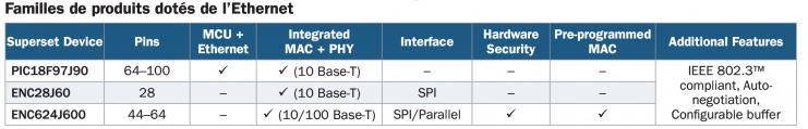 Microchip répond à la demande croissante de produits Ethernet embarqués avec les contrôleurs autonomes ENC624J600, ENC424J600 et ENC28J60, ainsi qu’avec la famille des PIC18F97J60, qui sont conformes IEEE 802.3™ et totalement compatibles avec les réseaux Base-T 10/100/1000. La solution Ethernet de Microchip inclut également une pile TCP/IP robuste et gratuite optimisée pour les