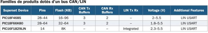 Microchip propose une gamme complète de microcontrôleurs 8, 16 et 32 bits répondant aux besoins des applications embarquées très performantes utilisant un bus CAN. Parmi les périphériques intégrés, citons : convertisseurs A-N, comparateurs, PWM de commande de moteur, USART (RS485, RS232, LIN) et Master I 2 C/SPI.