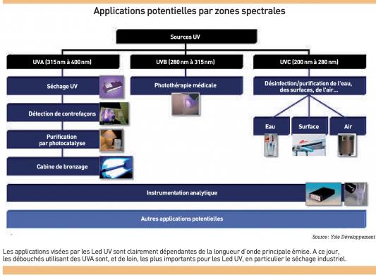Le marché des Led UV est en plein essor. Les récents progrès réalisés en termes de performances font qu’elles sont d’ores et déjà des alternatives sérieuses aux lampes UV classiques dans le domaine des UVA (notamment dans le séchage industriel). De plus, l’arrivée d’une offre en Led UVB et surtout UVC ouvre la voie à