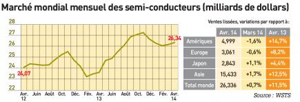 > Les ventes mondiales de semi-conducteurs ont démarré en trombe cette année! En effet, sur les 4 premiers mois, elles ont progressé de 10,7%, tandis que les ventes européennes, exprimées en dollars, se sont accrues de 7,5%. Cependant, l’effet du taux de change euro-dollar est sensible puisque la hausse pour le marché européen n’est plus