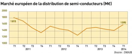 > Au 1 er trimestre 2014, le marché de la distribution européenne de semi-conducteurs industriels (hors composants pour PC) a progressé de 7,7% sur un an à 1,6 milliard d’euros. En France, la croissance a atteint 7,6 % (à 124M€). Au plan des produits, les plus fortes hausses ont été pour les discrets (+16,9 %