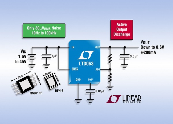 Ce LDO est apte à délivrer 200mA, avec une chute de tension de 300mV seulement. Il accepte une tension d’entrée comprise entre 1,6 et 45V et génère une tension de sortie ajustable entre 0,6 et 19V, précise à ±2% en fonction des variations de charge, de ligne et de température. Un unique condensateur est nécessaire pour un fonctionnement à faible bruit, soit 20µVeff dans la bande 10Hz à 100kHz. Le démarrage progressif de la référence de tension évite les surtensions en sortie lors de la mise en marche.