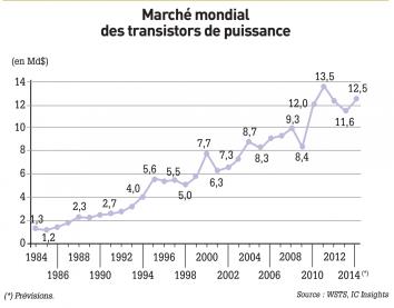 Pour 2014, IC Insights évalue à 12,5 milliards de dollars le marché des transistors de puissance. Soit une hausse de 8% par rapport à l’année précédente.