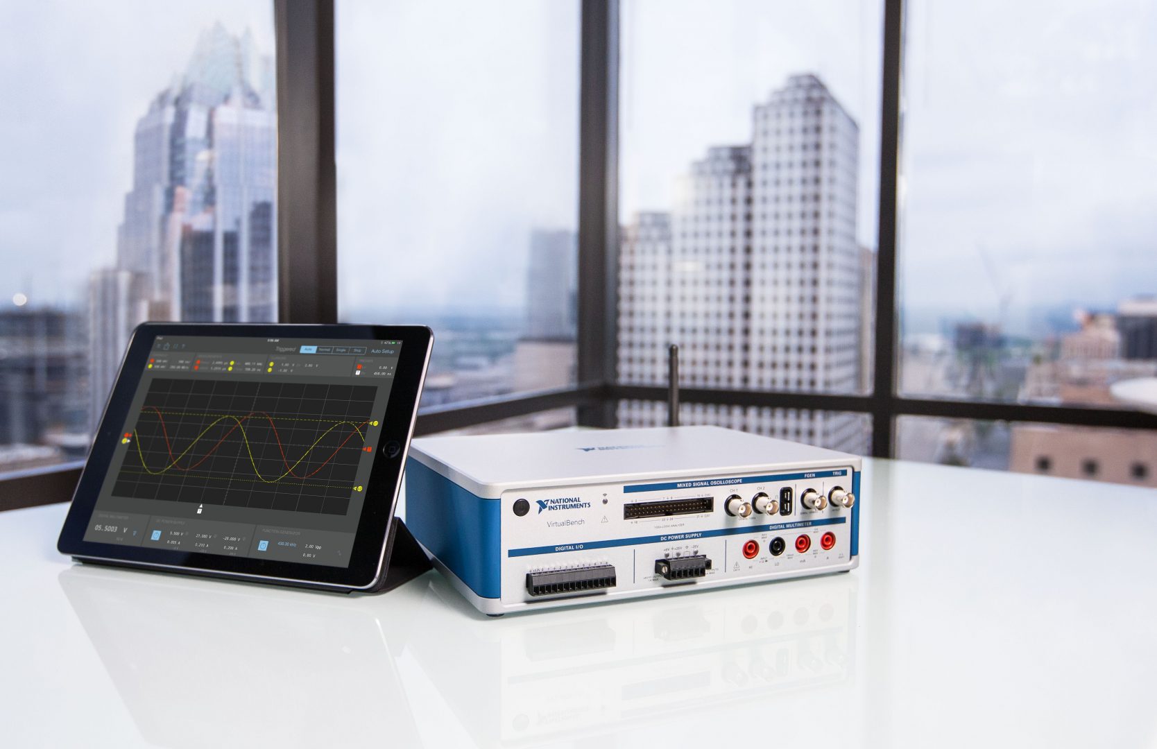National Instruments donne un coup de jeune aux appareils de mesure de table avec un instrument “tout en un” comprenant un oscilloscope à signaux mixtes, un générateur de fonctions, un multimètre numérique, une alimentation continue programmable et des entrées/sorties numériques, le tout pilotable via une interface logicielle sur PC portable ou tablette.
