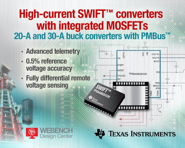 Texas Instruments complète sa gamme Swift de convertisseurs DC-DC avec deux modèles abaisseurs de 20A (TPS544B20) et 30A (TPS544C20) destinés à alimenter Asic, FPGA ou processeurs. Dans un boîtier QFN à 40 broches (5x7x1 mm), les deux produits intègrent les Mosfet de puissance, ainsi qu’une interface compatible PMBus pour la programmation, la surveillance en temps réel et le report des conditions de faute à l’hôte.