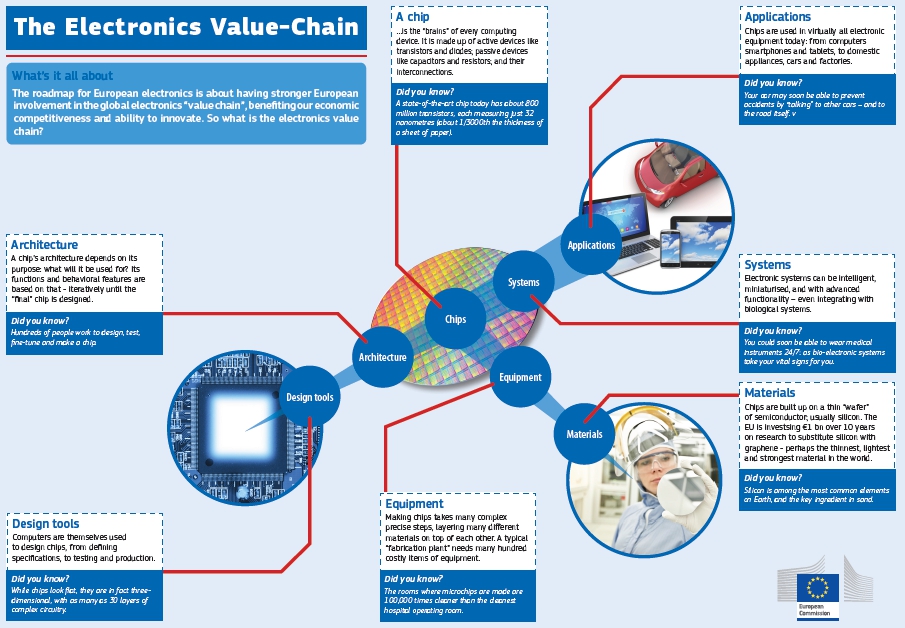 La Commission européenne vient de lancer un partenariat public-privé d’une valeur de 5 milliards d’euros intitulé Ecsel (« Composants et systèmes électroniques pour un leadership européen »), afin de stimuler les capacités de conception et de fabrication européennes en matière d’électronique. Cette initiative est au cœur de la stratégie électronique pour l’Europe dont le but est de mobiliser 100 milliards d’euros en investissements privés et de créer 250000 emplois en Europe d’ici à 2020. En même temps, la Commission a reçu les recommandations finales du groupe des leaders de l’électronique, qui rassemble les Pdg des plus grandes sociétés d’électronique en Europe, pour la mise en œuvre concrète et immédiate de cette stratégie.