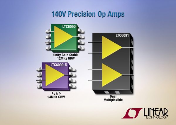 Les LTC6091 et LTC6090-5 sont les nouveaux membres de la famille LTC6090 d’amplificateurs opérationnels de précision haute tension de Linear Technology. Ces amplificateurs fonctionnent avec une tension d’alimentation de 140V (±70V), alors que leur structure d’entrée Cmos garantit un faible courant de polarisation (50pA max. à 85°C). Ce qui leur permet d’adresser les applications à base de capteurs pour lesquelles une forte impédance d’entrée est demandée.