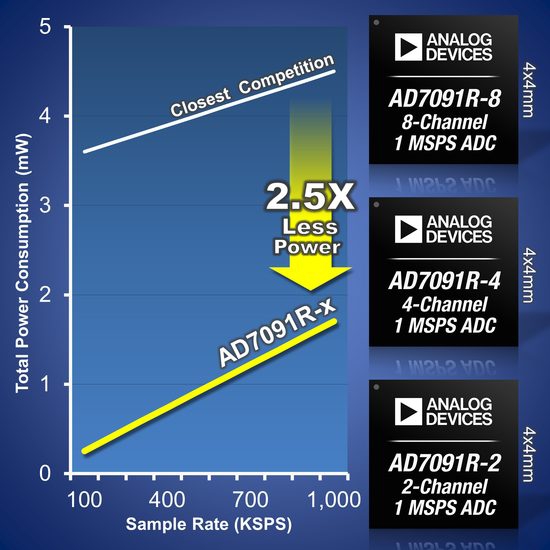 A leur pleine vitesse de 1 Méch./s, les CAN à approximations successives AD7091R-x se contentent de 1,7 mW.