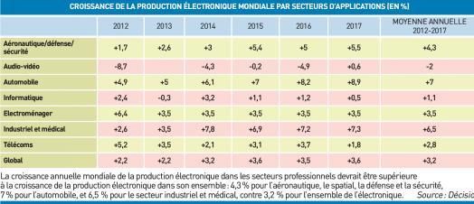 L’Europe devrait profiter de la croissance des marchés dits professionnels (automobile, aéronautique, industriel) sur la période 2012-2017, estime le cabinet d’études Décision, mais aussi, à plus long terme, du développement de marchés émergents, par exemple dans les domaines des objets connectés et de la voiture autonome.