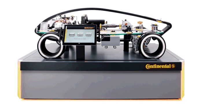 Véritable attraction à ICS, le véhicule du futur a fortement mobilisé les visiteurs. Présenté pour la première fois au salon mondial de l’automobile à Francfort, en septembre 2013, ce véhicule est un condensé complet de toutes les solutions technologiques de la division Powertrain (chaîne de traction) de l’équipementier qui permettent d’atteindre l’objectif de l’automobile propre et économique (moins de 2 litres aux cents kilomètres). « L’arrière de la voiture permet d’avoir un aperçu des technologies du moteur électrique, et l’avant présente les innovations produites par Continental en matière de contrôle pour un moteur thermique essence ou diesel », explique Jean-Luc Maté. « Notre enjeu fondamental, c’est de ramener la consommation des véhicules thermiques essence à un niveau qui permet de les conserver plus longtemps en bon état, en leur faisant consommer beaucoup moins ».
