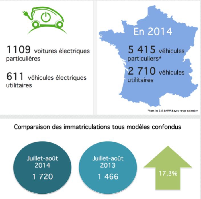 Sur les mois de juillet et août 2014, les immatriculations de véhicules électriques ont augmenté de 17,3% par rapport à 2013 pour atteindre 1 720 unités, tous modèles confondus, selon le dernier baromètre d’Avere France (Association nationale pour le développement de la mobilité électrique). Ce chiffre de 1720 unités se répartit entre les véhicules pour particuliers (1109 immatriculations, +23,9% sur un an) et les utilitaires légers (611 immatriculations, +7%).