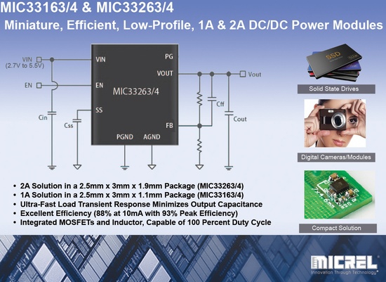 Les MIC33163/4 et MIC33263/4 de Micrel sont des modules de 1A ou 2A proposés dans des boîtiers de 2,5x3x1,1mm ou 2,5x3x1,9mm.