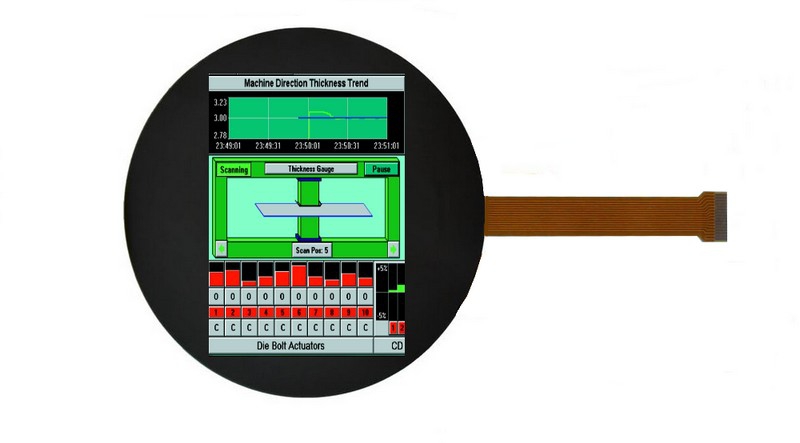 Pour rester dans l’air du temps, notre client a choisi une dalle capacitive projetée multi-touch. En ce qui concerne ses attentes aux niveaux intégration et règlementation anti-vandale, nous avons développé un verre de protection 6 mm d’épaisseur, de forme ronde (diamètre 130 mm), qui vient s’intégrer en optical bonding sur le TFT avec un contour noir. Idée simple qui fait son effet ! L’intégration est dans ce cas simplifiée car elle se fait par l’avant grâce au double-face intégré au dos du verre de protection.