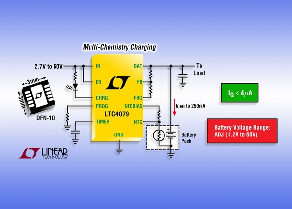 Avec le LTC4079, Linear technology introduit un chargeur de batterie d’architecture linéaire. Supportant les batteries au Li-ion, au nickel ou au plomb, le circuit supporte une tension d’entrée comprise entre 2,7 et 60V.
