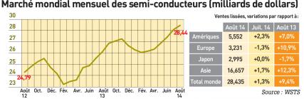 > 2014 est bien partie pour être une bonne année pour les semi-conducteurs. Sur les huit premiers mois, la croissance du marché mondial enregistre une progression de plus de 10% par rapport à la même période de 2013, tant au niveau mondial qu’en europe (voir ci-contre). les ventes du mois d’août ont atteint 28,435 milliards
