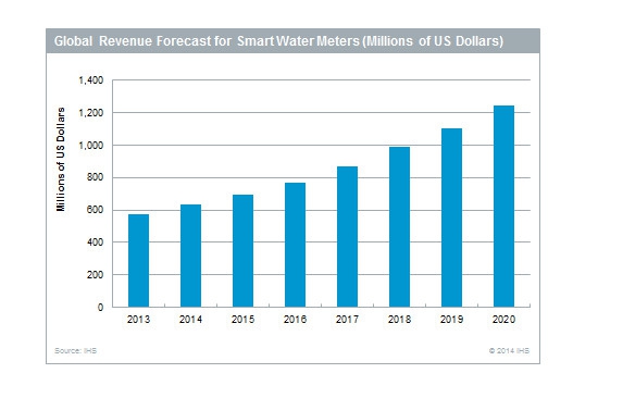 Le marché mondial des compteurs d’eau intelligents devrait passer de 575 millions de dollars fin 2013 à 1,1 milliard en 2019 estime IHS.
