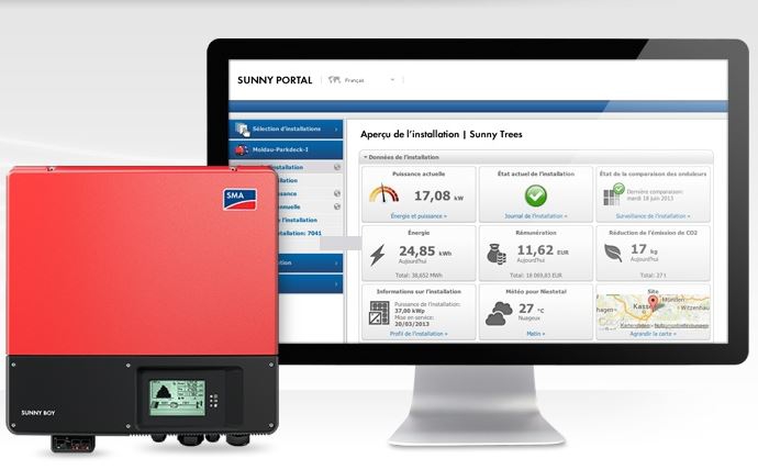 L’onduleur Sunny Boy se connecte à Internet en utilisant le routeur ADSL du domicile. La surveillance s’effectue par l’intermédiaire du Sunny Portal, le plus grand portail en ligne au monde dédié aux installations PV. Un accès aux données du Sunny Portal est obtenu de façon simple grâce à l’application idoine.