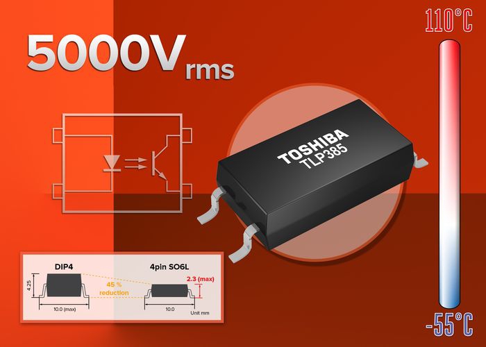 Le photocoupleur à sortie transistor TLP385 de Toshiba est encapsulé dans un boîtier de 2,3mm d’épaisseur, soit un gain de 45% par rapport aux modèles conventionnals au format Dip.