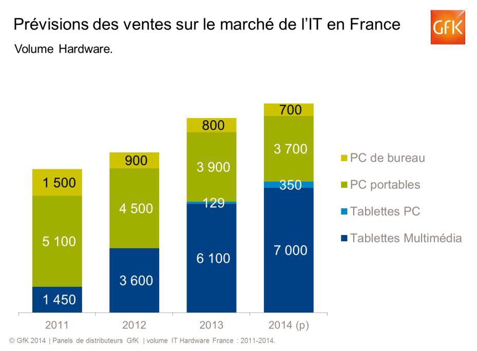 Outre les petits prix, Tristan Bruchet, directeur des marchés technologies de l’information chez GfK, confirme la bonne résistance du haut de gamme. « L’offre Premium se développe sur deux axes avec d’un côté les ultraportables – un segment qui se distingue par la finesse du châssis – et de l’autre les PC puissants, parfaitement appropriés pour la pratique du jeu vidéo ». En effet, bien que la nouvelle génération de consoles de salon bénéficie d’une vitesse d’adoption record, le segment “gaming” ne cesse de croître, à la fois sur le marché du PC portable, du PC de bureau ou des périphériques dédiés (souris, clavier et casques). Tous segments confondus, le recul du marché des PC portables devrait ainsi ralentir en 2014 pour s’établir à 3,7 millions de pièces, soit une baisse de 6% par rapport à 2013 contre – 13% en 2012.