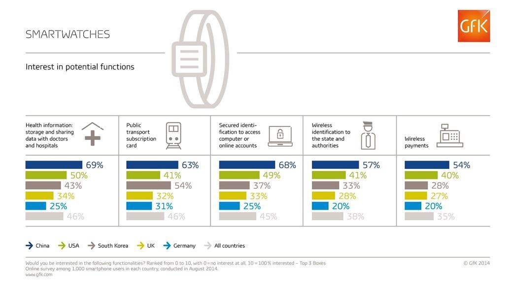 Ces conclusions proviennent d’une étude internationale dans laquelle l’Institut d’études marketing GfK a demandé à 5000 personnes équipées de smartphones en Chine, aux Etats-Unis, en Allemagne, au Royaume-Uni et en Corée du Sud, s’ils seraient intéressés par l’exécution de certaines fonctions spécifiques via une montre connectée, en admettant qu’ils puissent enregistrer et transmettre leurs données de manière sécurisée.