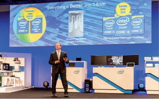 Intel a choisi d’orienter ses premiers processeurs Core fabriqués en technologie FinFET 14nm vers des applications basse consommation telles que les ordinateurs portables et 2-en-1 (tablettes transformables en notebooks via un clavier clipsable), avec un maître mot : “fanless”. Situés en entrée de gamme de la famille Core (en dessous des Core i3), ces microprocesseurs Core M en reprennent la microarchitecture. Ils embarquent deux cœurs physiques cadencés jusqu’à 2,6GHz, ainsi qu’un moteur graphique (HD Graphics 5300), 4Mo de mémoire cache et deux canaux DDR3L/ LPDDR3 cadencés jusqu’à 1,6GHz. La plupart des fonctions classiques des processeurs Core sont présentes ici : technologies Turbo Boost 2.0 (augmentation conditionnelle de la fréquence de travail) et Hyperthreading (deux tâches gérées par cœur), cryptage de données AES et génération de nombres aléatoires…