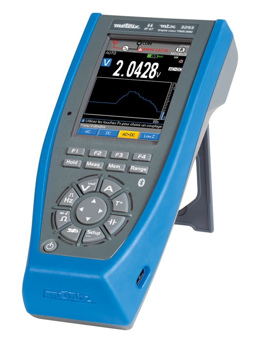 Metrix a en effet conçu des appareils compacts, utilisables d’une seule main, grâce à un agencement optimisé des touches et à l’absence d’un commutateur rotatif, et dotés pour la première fois d’un écran graphique couleur (modèles MTX 3292 et MTX 3293). Le fabricant n’a nullement oublié les performances métrologiques avec une précision de base 0,02 %, des niveaux de sécurité jusqu’à CAT IV 600 V ou CAT III 1 000 V, etc.