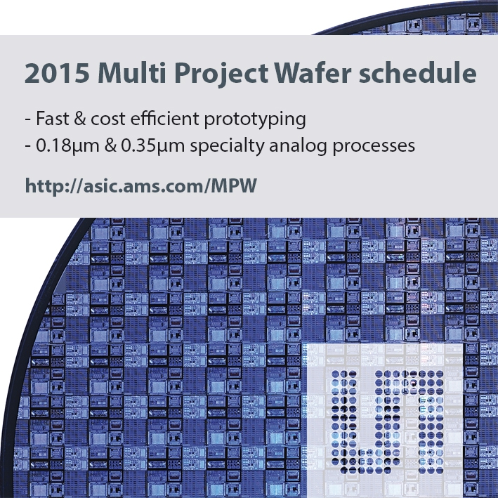 L’autrichien ams vient de lancer un programme de fabrication de circuits sur tranches multi-projets ou MPW (Multi-Project Wafer) au sein de sa division Fonderie. Ce service permet de faire fabriquer à moindre coût des circuits analogiques et mixtes et des capteurs en partageant plusieurs circuits de plusieurs clients sur une même tranches. La première production est prévue pour 2015.