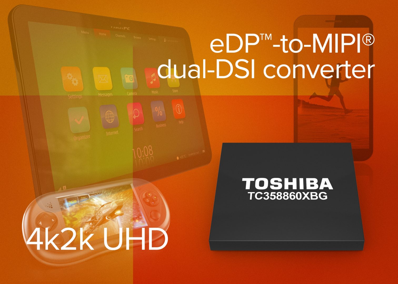Toshiba lance le TC358860XBG, un jeu de circuits destiné aux tablettes et consoles de jeu portables et permettant de convertir des signaux entrants embedded DisplayPort (eDP) v1.4 en signaux MIPI DSI double accès, et donc d’offrir des contenus UHD sur un appareil portable.
