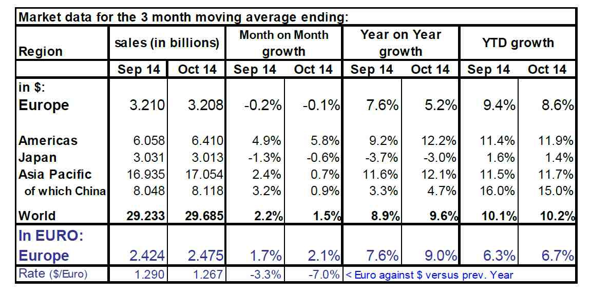 Sur les dix premiers mois de l’année, la croissance des ventes européennes, exprimée en dollars, a atteint 8,6% par rapport à la même période de 2013.
