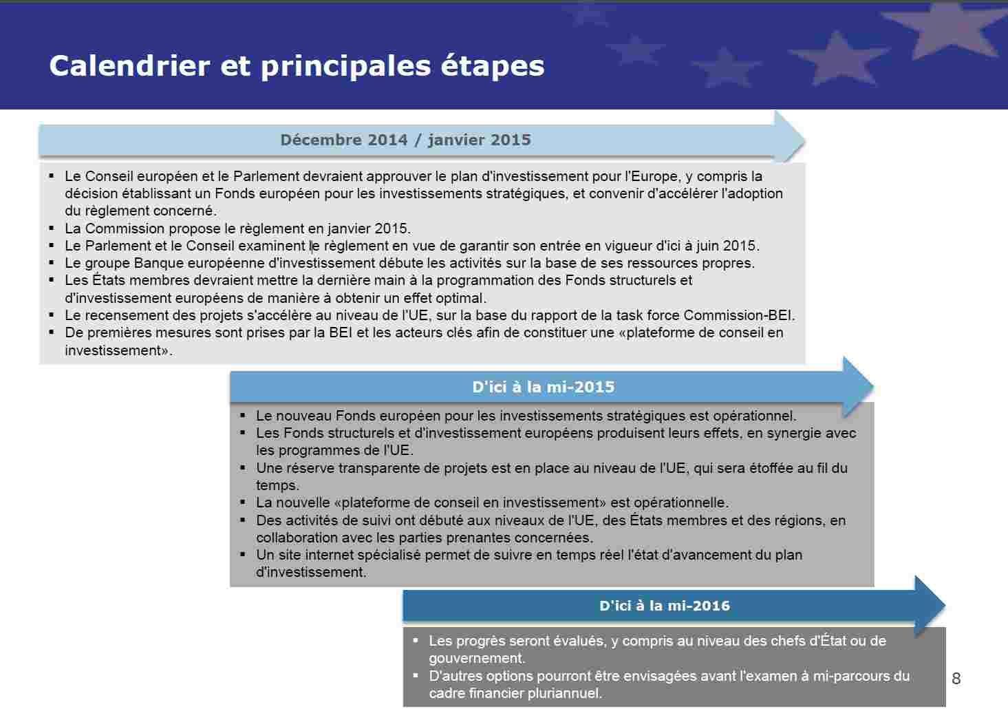 Le groupe de travail de l’Union européenne sur les investissements a publié un rapport indiquant qu’il existe un potentiel d’investissement significatif en Europe. Ce rapport recense environ 2 000 projets dans toute l’Europe équivalant à près de 1 300 milliards d’euros d’investissements potentiels, dont des projets pour plus de 500 milliards d’euros qui pourraient être mis en œuvre au cours des trois prochaines années. De nombreux projets ne sont actuellement pas réalisés en raison d’obstacles financiers, réglementaires ou autres.