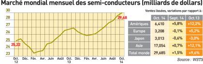 > Le marché mondial des semi-conducteurs confirme sa progression de mois en mois, et l’on peut d’ores et déjà s’attendre à une hausse de l’ordre de 10% sur l’ensemble de l’année 2014. Sur les dix premiers mois, la croissance du marché, calculée en dollars, est déjà de 10,2% au niveau mondial et de 8,6% en