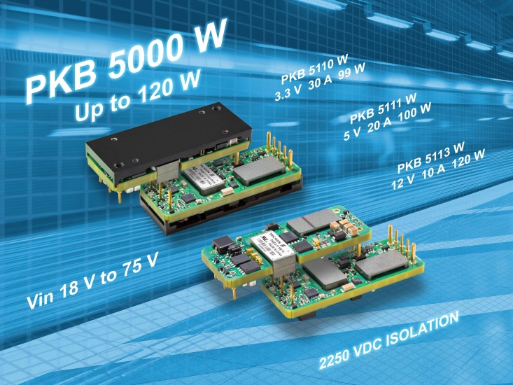 La série est déclinée en différents modèles fournissant une sortie 2,3V/30A (PKB5110WPI), 5V/20A (PKB5111WPI) ou 12V/10A (PKB5113WPI). Tous fonctionnent entre -40°C et +110°C et offrent une isolation de 2250Vdc entre entrée et sortie.