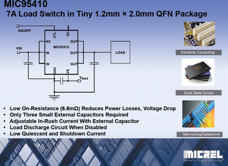 Micrel annonce le MIC95410, un commutateur de charge côté haut de 7A encapsulé dans un petit boîtier QFN de 1,2x2mm. Le circuit fonctionne à partir d’une tension de polarisation comprise entre 2,7 et 9V.