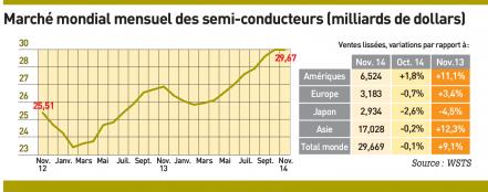 > Sur les onze premiers mois de l’année, la progression des ventes mondiales de semi-conducteurs est de 10% par rapport à la même période de 2013, estime le WSTS. En Europe, la croissance est de 8% entre janvier et novembre, et de 9,9% si l’on compare le mois de novembre 2014 au mois de novembre