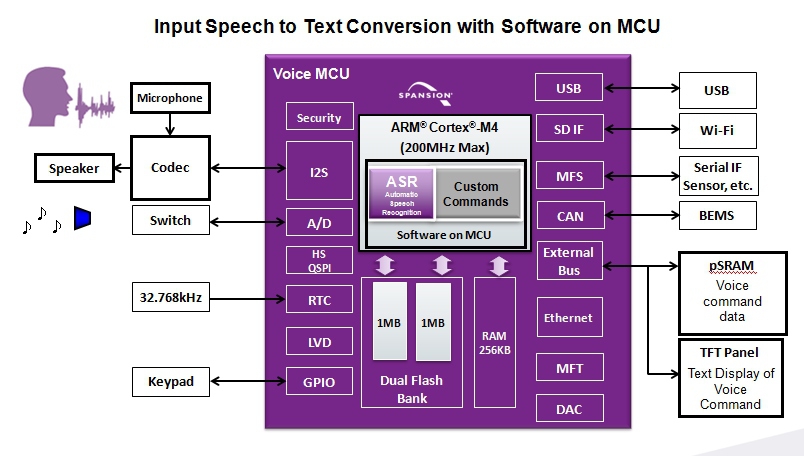Les seconds embarquent un bloc de commande vocale, capable de gérer plus de 100 commandes différentes (en anglais, chinois, allemand ou japonais) qui sont stockées en mémoire flash (jusqu’à 2Mo) et décodées en temps réel. Le coeur des S6E2CCxx/MB9BF568F est en fait un Cortex-M4F cadencé jusqu’à 200MHz. Ils sont vendus à partie de 6,95$ pièces par quantités de 10000.