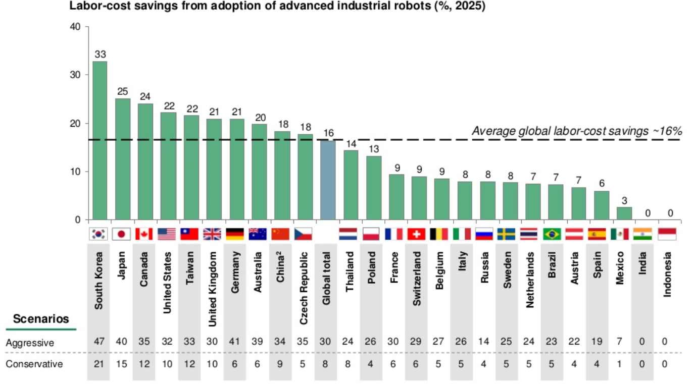 Les gains les plus importants se produiront dans les pays qui seront à la pointe du déploiement de robots industriels, comme la Corée du Sud, la Chine, les Etats-Unis, le Japon et l’Allemagne. Les coûts de main d’oeuvre en 2025, après ajustement des chiffres de l’inflation normales et application d’autres mesures d’amélioration de la productivité, devraient être de 18% à 33% inférieurs dans ces économies où les robots seront utilisés.