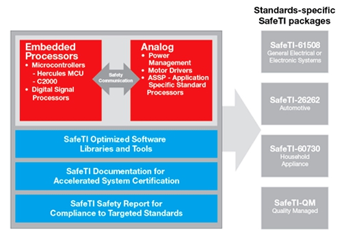Texas Instruments voit son environnement de développement logiciel SafeTI certifié par TÜV NORD pour la conception logicielle en conformité aux standards ISO 26262 et IEC 61508. En outre, l’américain a ajouté de nouveaux modules CSP (Compliance Support Packages) destinés à ses microcontrôleurs Hercules.