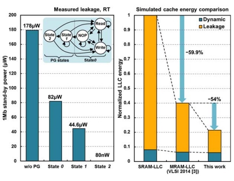 La consommation, elle, est réduite à 44,6µW en veille et 80nW en veille profonde, ce dernier mode étant obtenu par une gestion affinée du power gating et n’induisant qu’une latence de 21ns.
