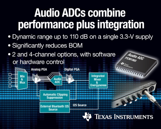 Texas instruments annonce une série de six CAN de résolution 24 bits avec frontal universel, compatibles broche à broche, pour applications audio (téléviseurs, systèmes de Home Theater, haut-parleurs Bluetooth…). D’un côté, les PCM1860/1/2/3 sont des versions à deux canaux, de l’autre les PCM1864/5 en offrent quatre.