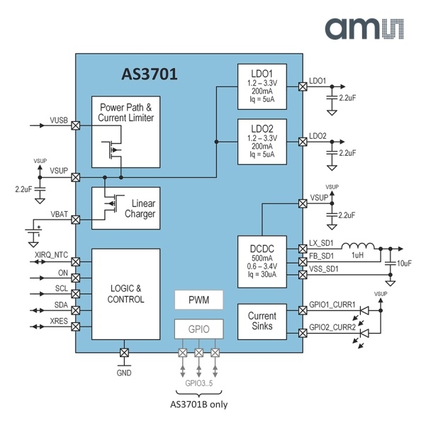 Le circuit AS3701 d’ams embarque notamment un chargeur de batterie, un convertisseur DC-DC, deux régulateurs linéaires et deux sources de courant.