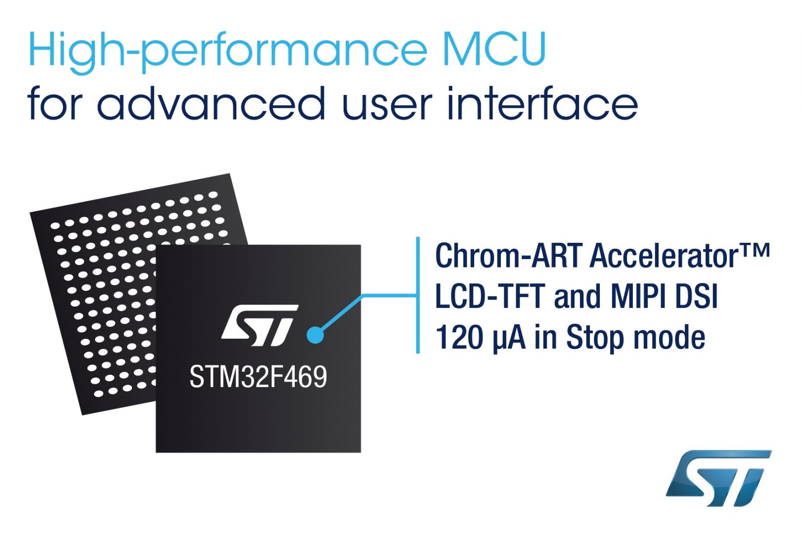 STMicroelectronics étoffe sa famille de microcontrôleurs 32 bits STM32 avec les STM32F469/479, des modèles qui se distinguent par la présence d’un accélérateur graphique Chrom-ART et d’une interface MIPI-DSI.