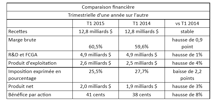 Intel vient d’annoncer un chiffre d’affaires de 12,8 milliards de dollars pour le premier trimestre 2015, un résultat opérationnel de 2,6 milliards de dollars et un bénéfice net de 2 milliards de dollars. Les ventes sont stables par rapport au premier trimestre 2014 (+0,1%) et devraient le rester sur l’ensemble de l’année. Les bonnes performances dans les centres de données ou les objets connectés compensant une situation toujours difficile dans les PC. Le fabricant américain a augmenté son bénéfice net de 3% à 2 milliards de dollars sur les trois premiers mois de 2015.