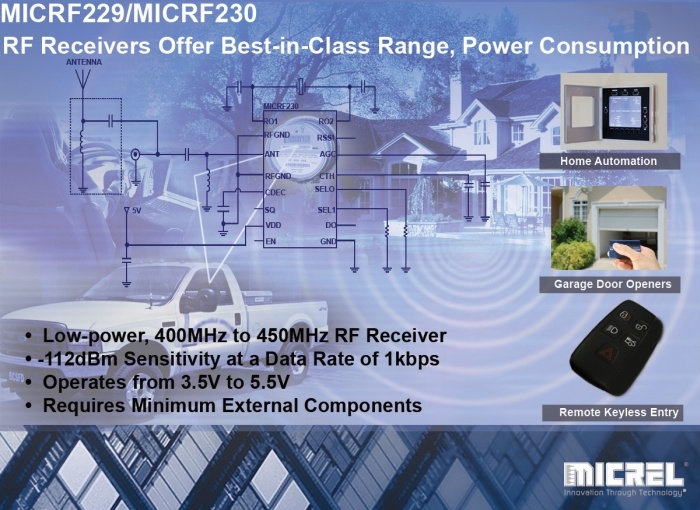 Avec les MICRF229 et MICRF230, Micrel introduit deux récepteurs d’architecture superhétérodyne utilisables dans la bande 400 à 450MHz. Ces circuits mettent en œuvre une modulation ASK/OOK. Ils sont crédités d’une sensibilité de -112dBm, pour un débit de 1kbit/s et avec un taux d’erreur bit de 1%. Ils requièrent un quartz et une poignée de composants externes.