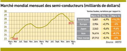 > Au niveau mondial, les ventes de semi-conducteurs ont totalisé 27,712 milliards de dollars en mars, en très légère baisse (-0,1%) par rapport au mois précédent et en hausse de 6% par rapport à mars 2014. Sur l’ensemble du premier trimestre 2015, les ventes ont également progressé de 6% par rapport à la même période