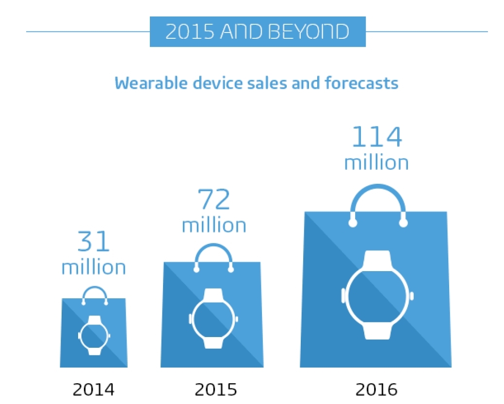 Le cabinet GfK prévoit que 72 millions d’unités devraient êtrevendues dans le monde en 2015, principalement dans les régions développées. En France, il devrait se vendre 1,8 millions de produits « wearables », parmi les montres et autres traqueurs d’activité.