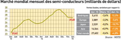 > Au niveau mondial, les ventes de semi-conducteurs ont totalisé 27,602 milliards de dollars en avril, en très légère baisse (-0,4%) par rapport au mois précédent et en hausse de 4,8% par rapport à mars 2014 (alors que la variation annuelle était de 6% le mois dernier). Sur les quatre premiers mois de l’année 2015,