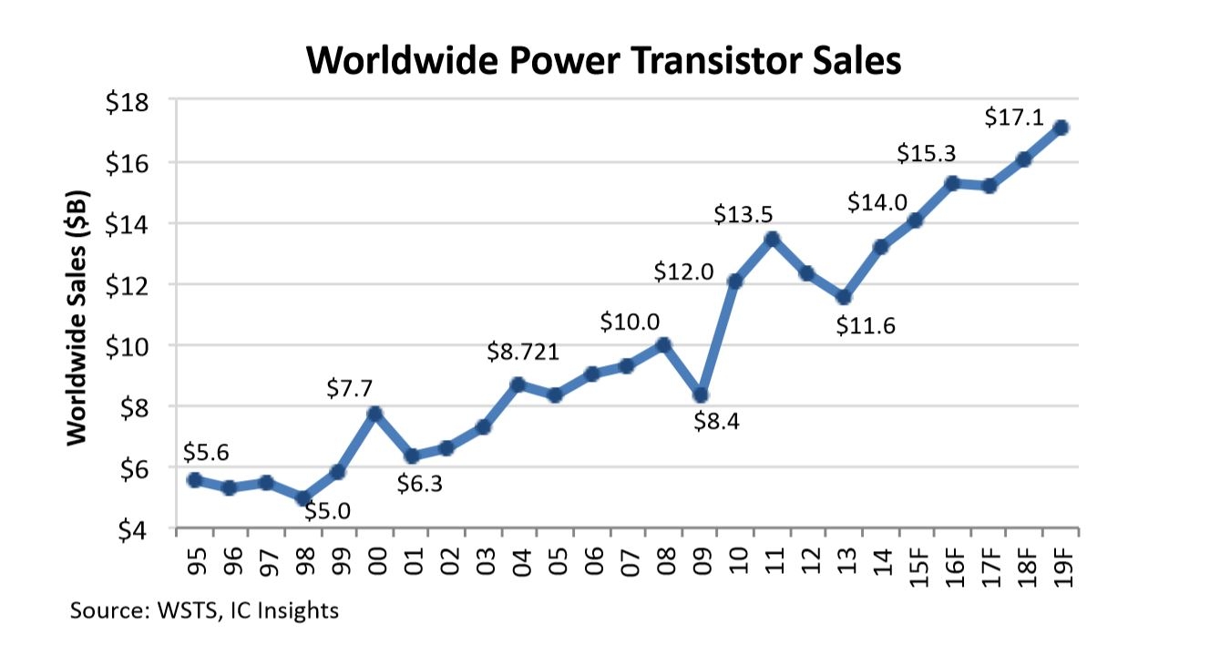 Pour l’ensemble du marché des semi-conducteurs discrets de commodité (23 milliards de dollars en 2014), les transistors de puissance ont tiré la croissance pendant les trois dernières décennies. Les ventes de transistors de puissance ont ainsi représenté 58 % du total des ventes de semi-conducteurs discrets en 2014, contre 51 % en 2004 et 36 % en 1994.