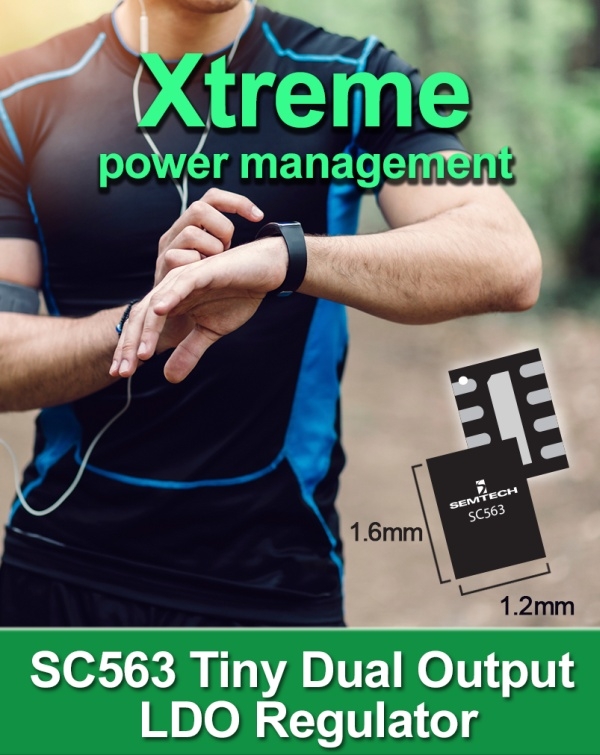 Proposé dans un petit boîtier de 1,6×1,2mm, le SC563 de Semtech offre deux sorties régulées délivrant chacune 300mA.