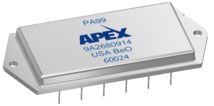 Estampillé PA99, le produit est susceptible de délivrer 2400V crête-à-crête et un courant continu d’intensité 50mA. Il est crédité d’un produit gain-bande de 28MHz et d’un slew rate de 28V/µs.