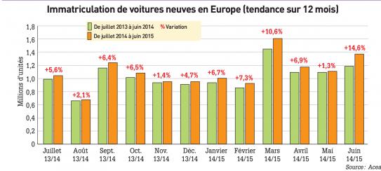 Le marché européen des véhicules de tourisme a progressé 8,2% au premier semestre 2015 et de 14,6% sur le seul mois de juin, selon l’Association des constructeurs européens d’automobiles (Acea) qui prévoit désormais une croissance de 5% sur l’ensemble de l’année.